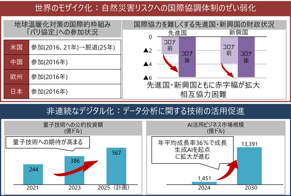 資料:みずほリサーチ&テクノロジー(2025年)「財政懸念による金利上昇リスクが高まる兆し」、Qureca(2021,2023, 2025年)「Quantum Initiatives Worldwide」、Artemis(2025年)「Catastrophe bonds & ILS issued and outstanding by year」など各種資料より日立総研作成